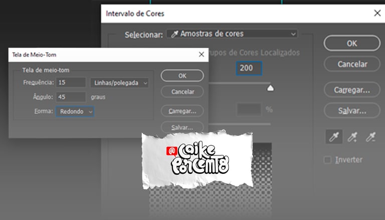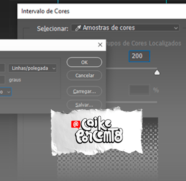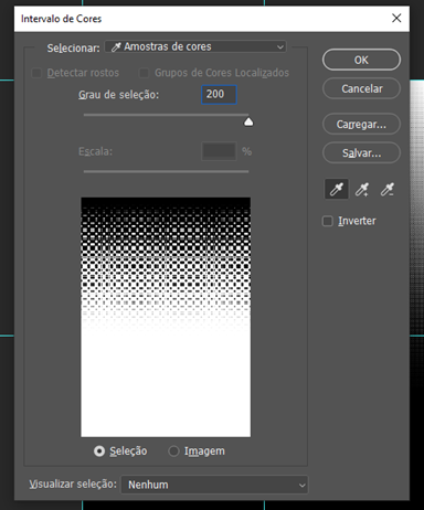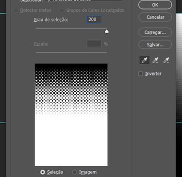 8 – Para tirar o fundo branco, volte em Imagem>Modo>Tons de Cinza , depois Selecionar>Intervalo de Cores, com o conta gotas, clica no preto para selecionar a cor, e no Grau de seleção, coloque 200. De Ok e clique no icone de mascara.
